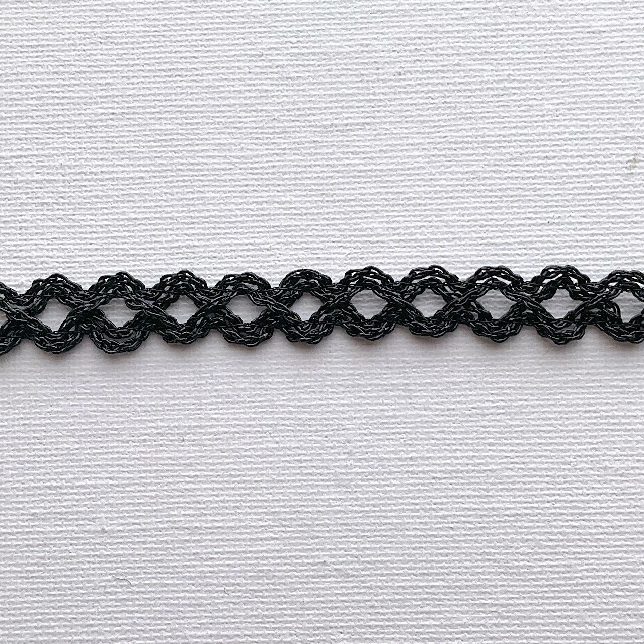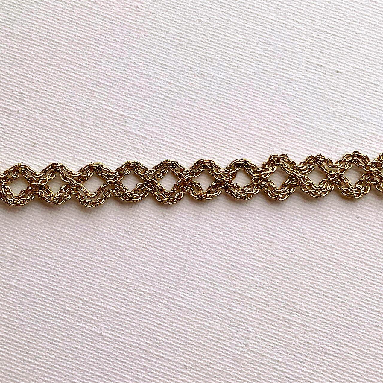 京都の糸屋さんから購入したラメ糸をリリアン加工し、太めのチェーン柄に編んだ、チェーン柄ブレードです。少しラメが硬いのでご好評頂いているチェーンブレードより若干硬い仕上がりになりますが、カラーヴァリエーションがございます。